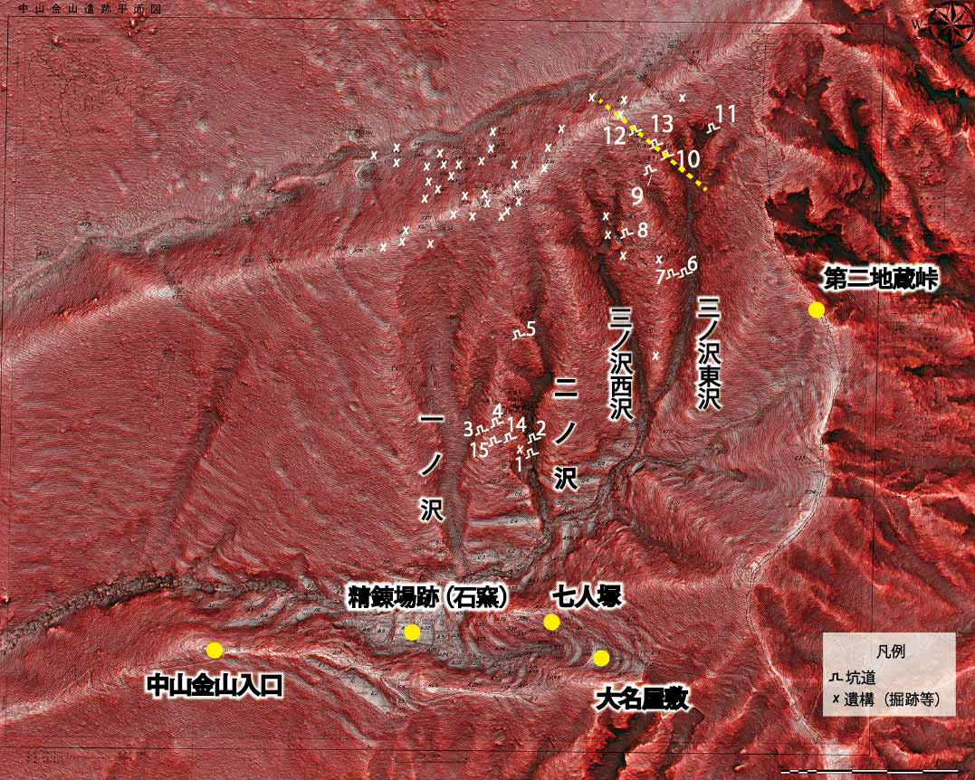 日本における金山開発は長い歴史を持つものの、明治時代に近代地質学と呼ばれる学問系統が西洋から日本に導入されるより前の鉱山開発技術に関する実像は詳細にはわかっていません。中山金山には戦国時代以外にも江戸時代天明年間に開発された坑道(坑道番号:9,10,11,12,13)が存在し、記録上は天明8年(1788年)に、大規模に金山開発をしてこれらの坑道を掘ったものの、金が出なかったとされています。
