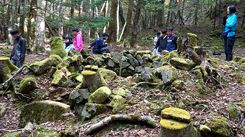 この地域は地質学的には南部フォッサマグナと呼ばれ、日本列島の東北側と西南側の地質学的境界にあたります。この実習では、地形図を見ながらプレートテクトニクスの観点で湯之奥金山の位置付けを知り、金山遺跡を見ながら、金山から流れる沢の岩石を観察し、金山を生み出した地質変動の痕跡を探ります。