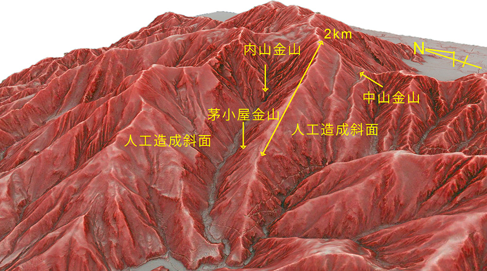 - 湯之奥金山遺跡の高精度赤色立体地図を作成し、国史跡に指定されている中山金山(16ヘクタール)の外に、同様の特徴の斜面がさらに広範囲(150ヘクタール、東西2 km、南北1.3 km、標高900 mから1,850 m)に及んでいることが確認された。この巨大斜面は、国史跡である中山金山(16ヘクタール)の地盤に相当する。